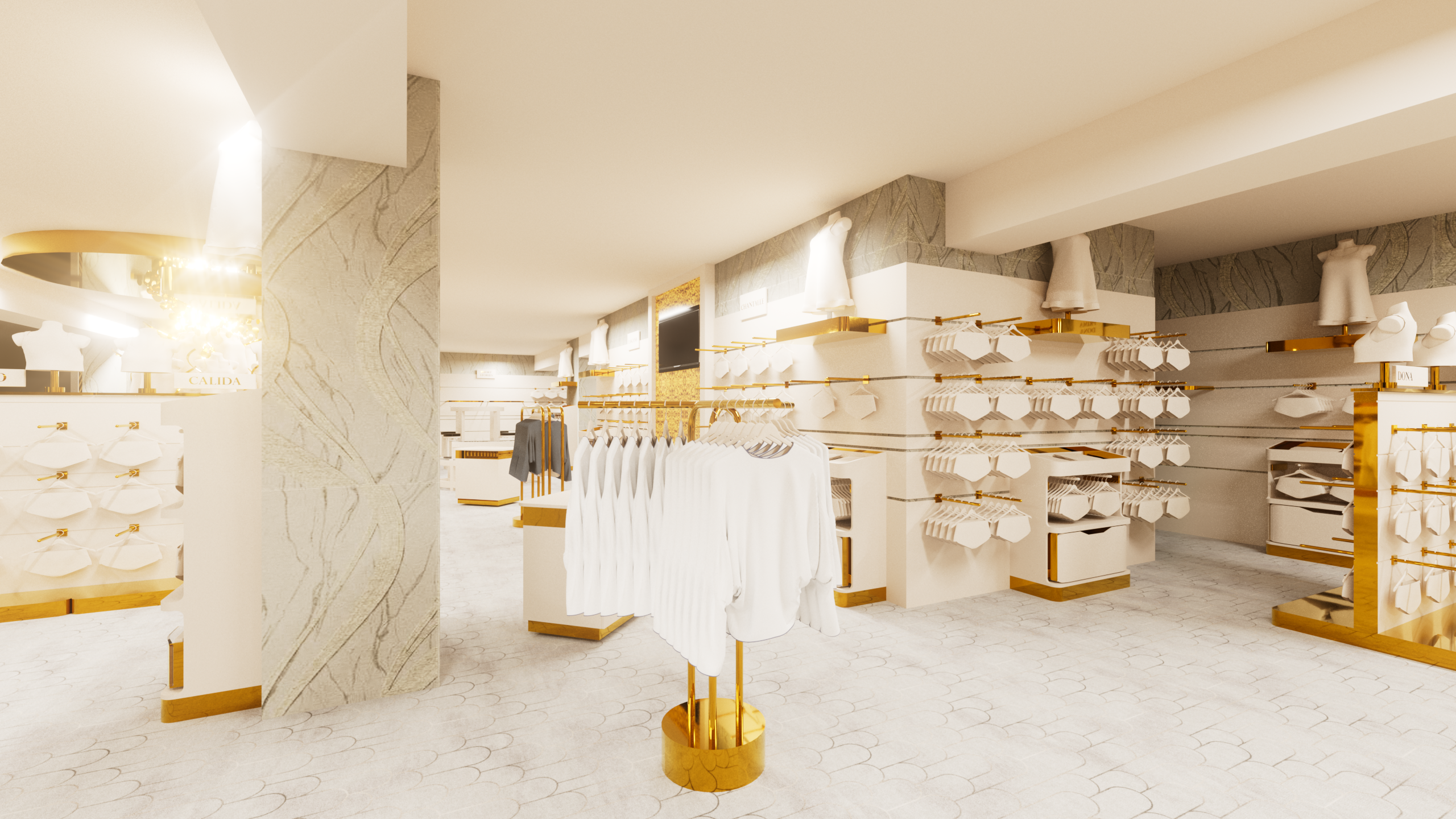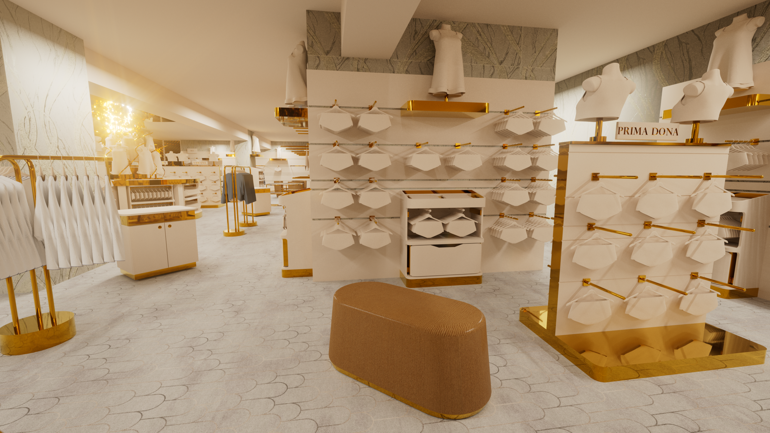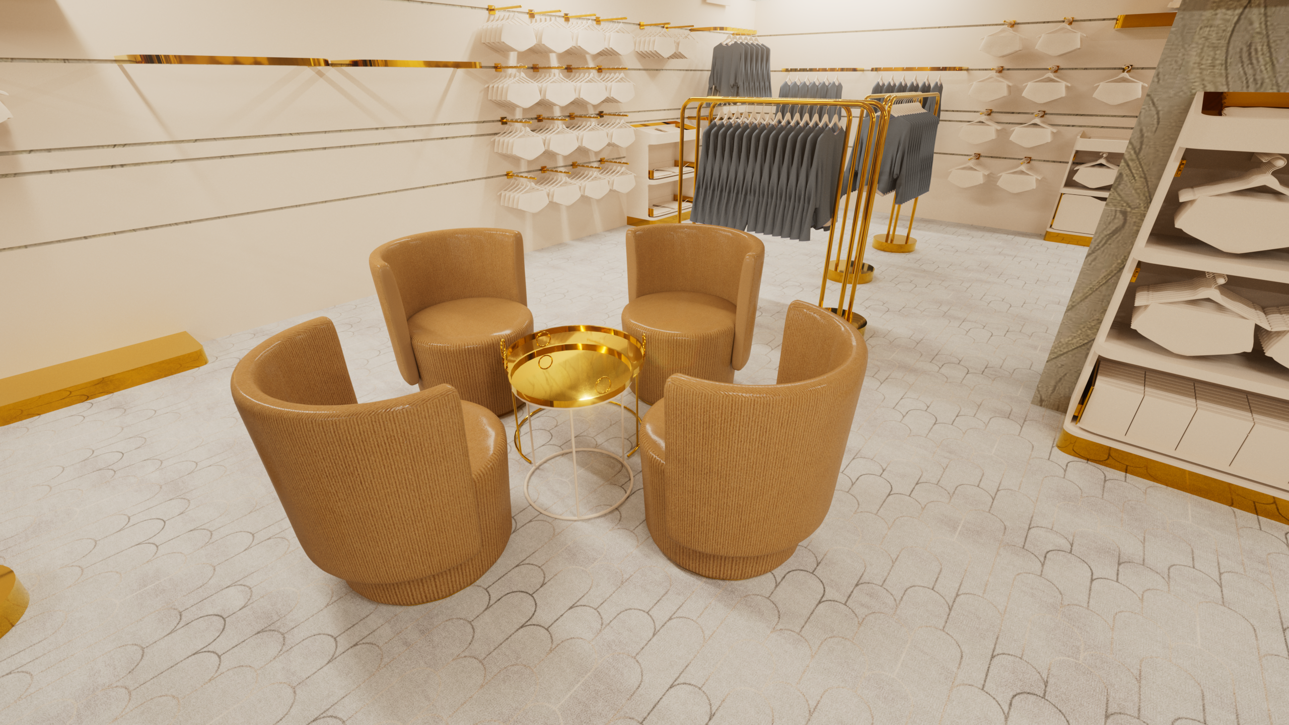 Das Konzept hinter dieser Einrichtungslinie verbindet luxuriöses Design mit maximaler Funktionalität. Die Möbelstücke sind so gestaltet, dass sie nicht nur eine hochwertige Präsentation der Produkte ermöglichen, sondern auch flexibel an unterschiedliche Raumkonzepte angepasst werden können. Goldene Details setzen edle Akzente, während die klare Struktur der Möbel die Ware in den Vordergrund rückt. Dieses Designkonzept schafft eine einladende und stilvolle Atmosphäre, die den Verkaufsraum optisch aufwertet und ein einzigartiges Einkaufserlebnis garantiert.