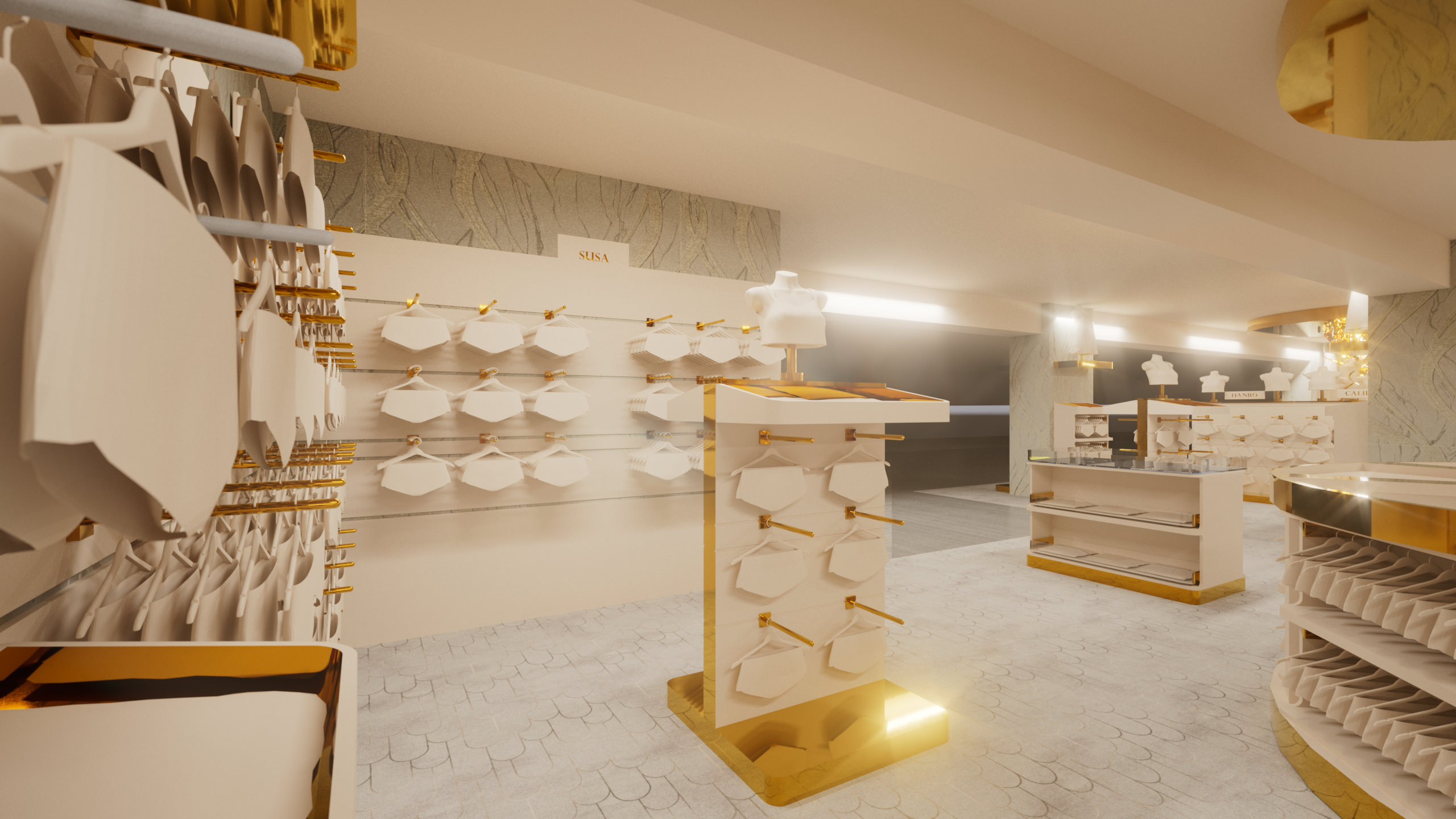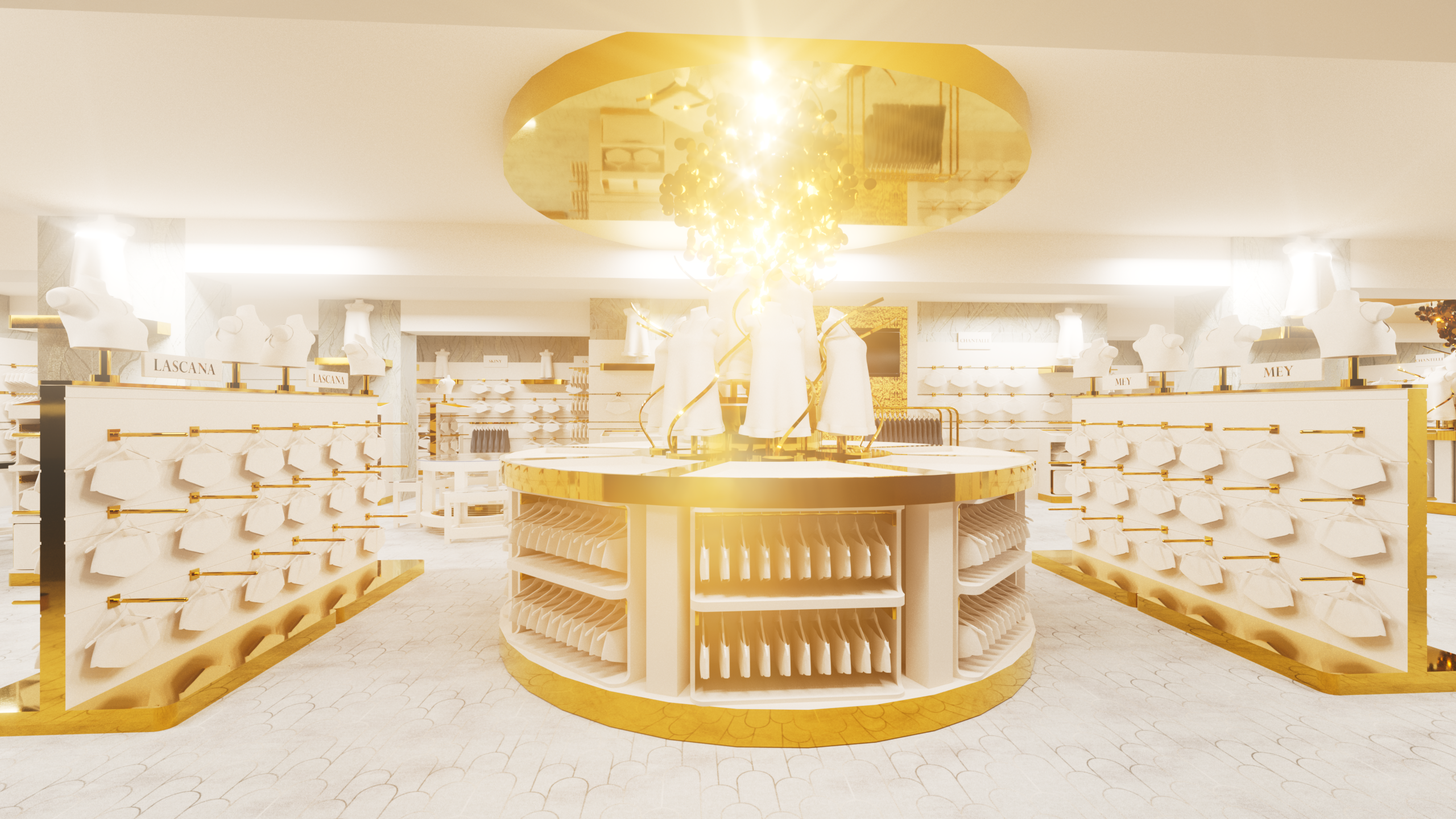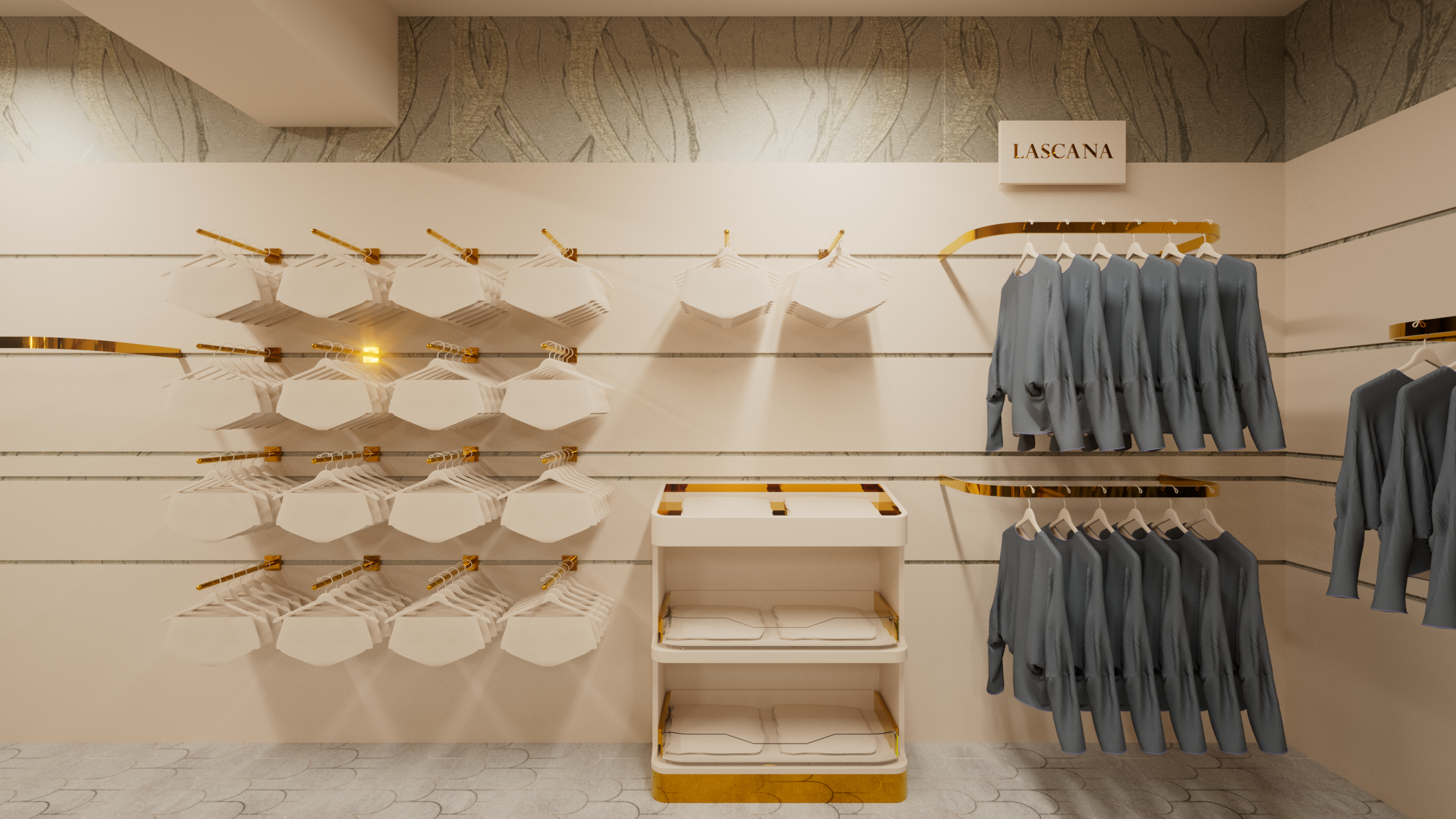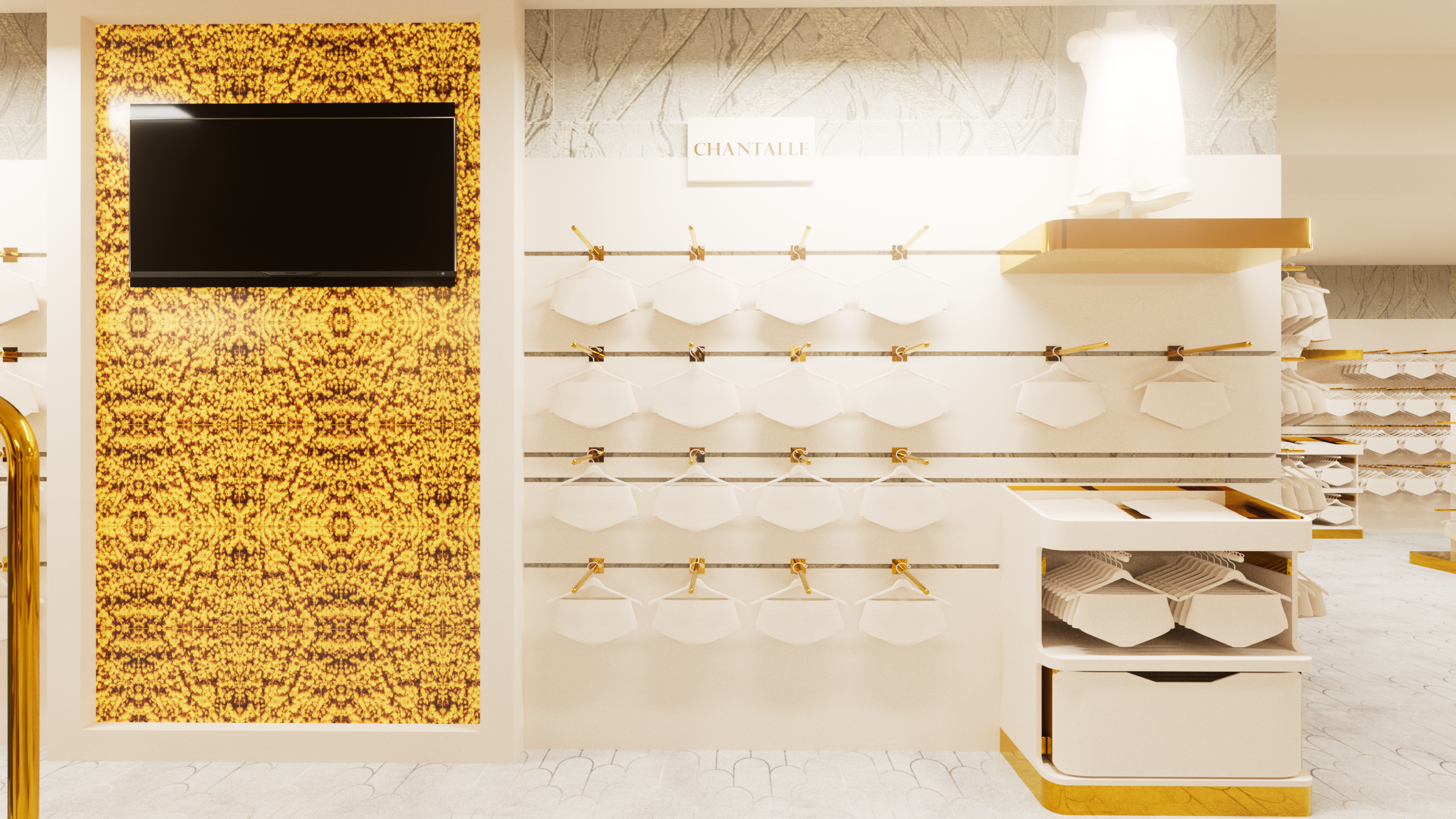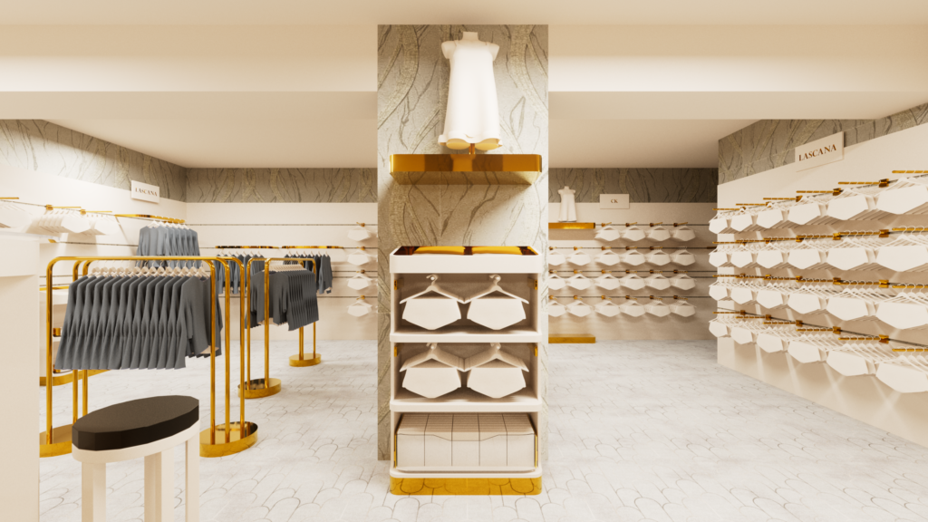 Das Herzstück dieses Konzepts sind freistehende Mittelmodule, die maximale Flexibilität bieten und gezielt für die Präsentation von Bodywear entwickelt wurden. Die Kombination aus offenen Ablageflächen, hängenden Elementen und integrierten Fächern ermöglicht eine klare und strukturierte Warenpräsentation. Die goldenen Details setzen luxuriöse Akzente, während die durchdachte Gestaltung den Fokus auf die Ware legt. Dieses Möbelstück ist ideal, um unterschiedliche Marken hochwertig und übersichtlich zu inszenieren.